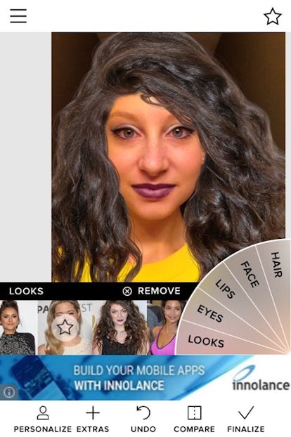 Men den kan mer än smink. Den här appen frestar mig just nu att skaffa päls, tack vare Bella Thorne. ModiFace’s frisyrer är utvalda från kändisars röda mattor. Du kan prova Solanges naturliga hår eller Sarah Hylands perfekta toppknut. Personligen tyckte jag att jag såg bra ut med Lordes tjocka, mörka, lockiga lockar, vilket är raka motsatsen till mitt hår IRL.